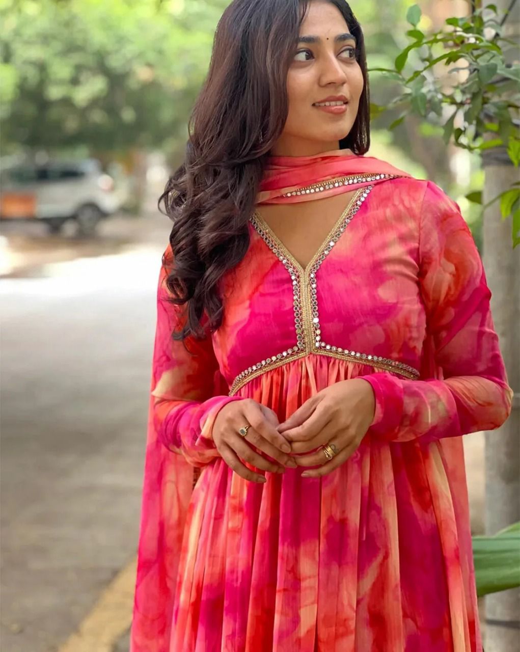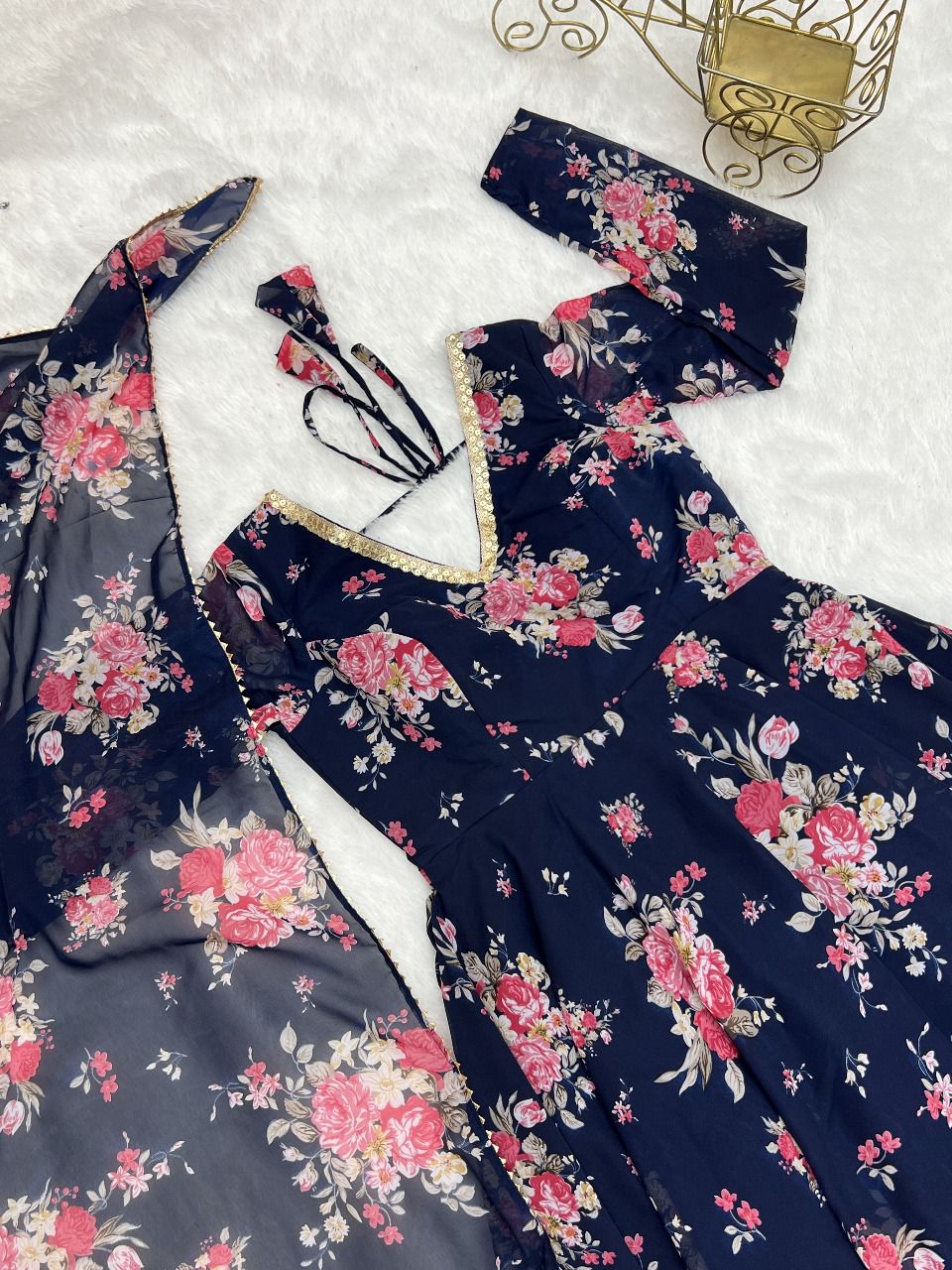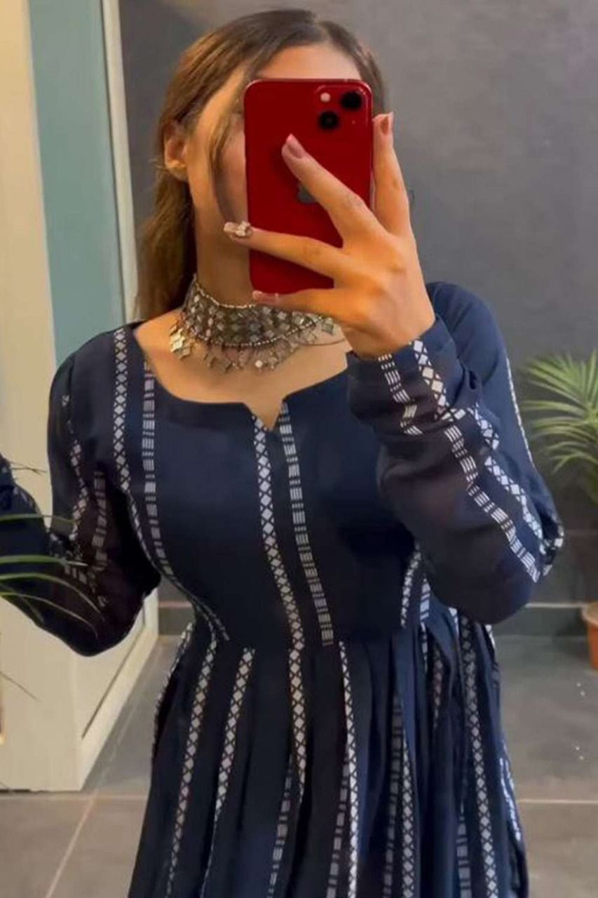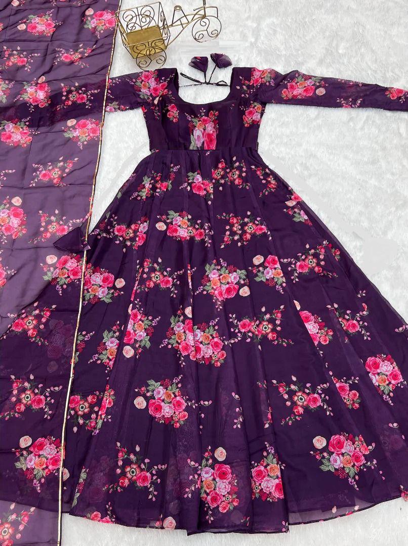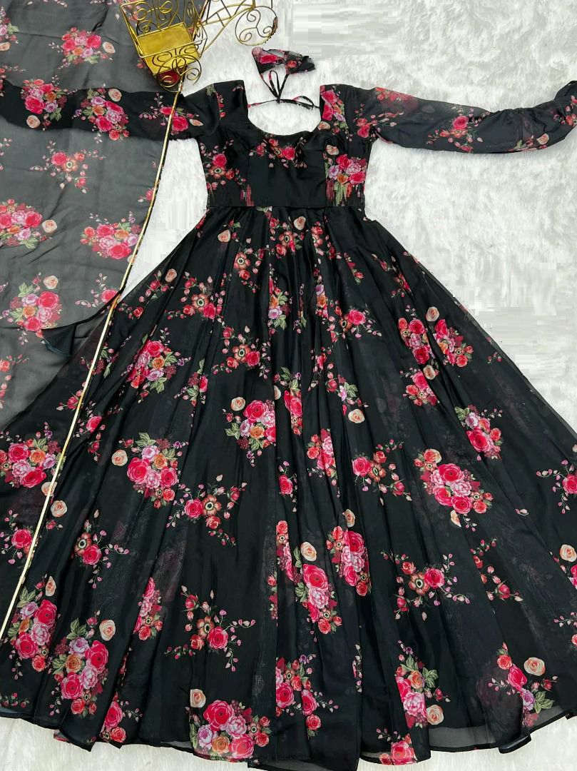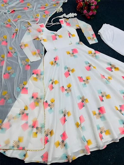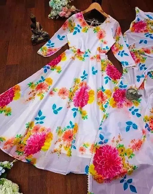 The gowns are made from georgette fabric, which is known for its lightweight texture, smooth finish, and elegant drape. Georgette outfits are very popular among women because they offer both comfort and a fashionable appearance.