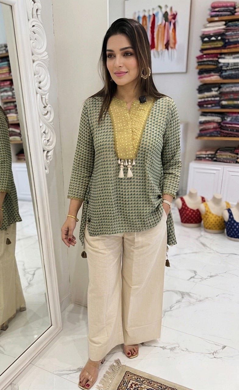 The highlight of this collection is the heavy double original mirror work with embroidery, along with tassel and lace detailing. These design elements add a rich and elegant look, making the outfit suitable for both casual and semi-festive wear.